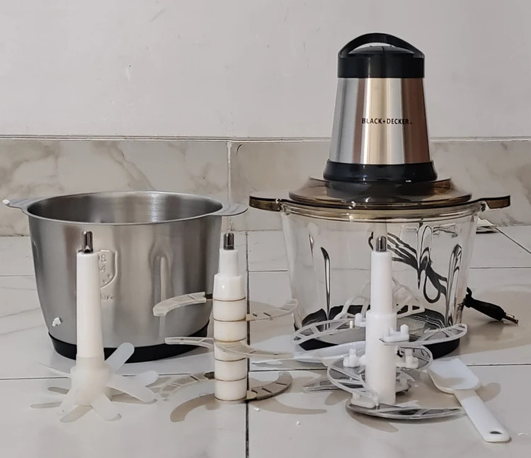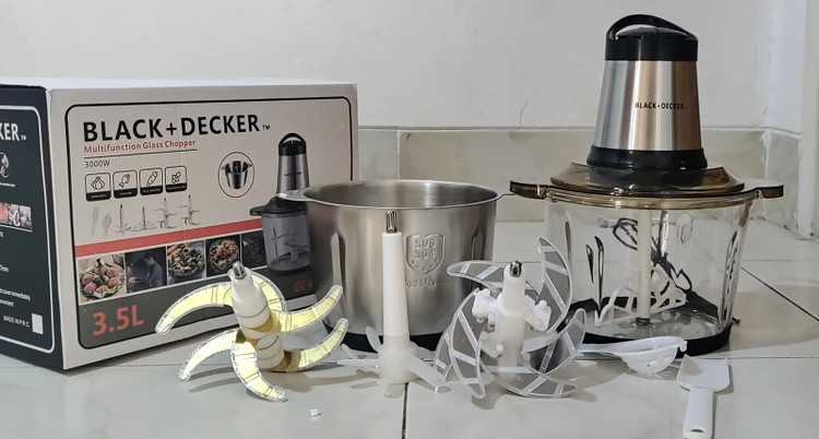 خردکن حرفه ای Black and deckr یک عدد کاسه استیل 3.5 لیتری یک عدد کاسه شیشه ای 3.5 لیتری 6تیغ طلایی تیتانیومی 4تیغ استیل زاپاس موتور 5030 مسی توان موتور 3000وات دو سرعته
